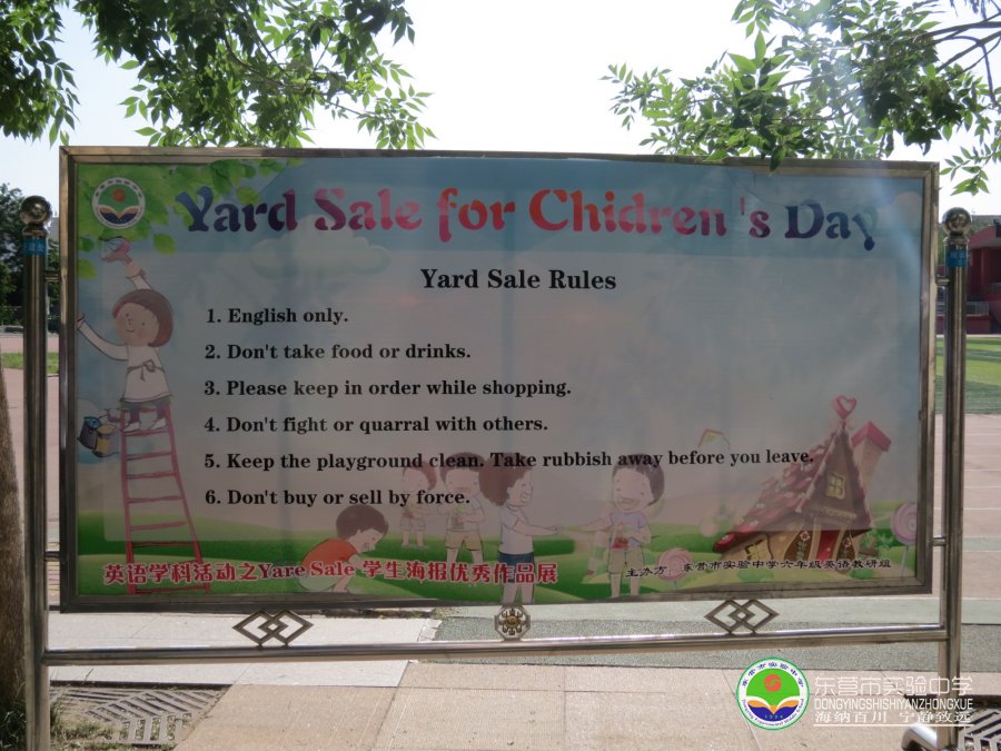 为庆祝六一儿童节、调动学生英语学习的学习兴趣、创设英语学习氛围。六年级英语组于6月1号下午在学校操场举行了主题为“Yard Sale for School Children’s Day”。