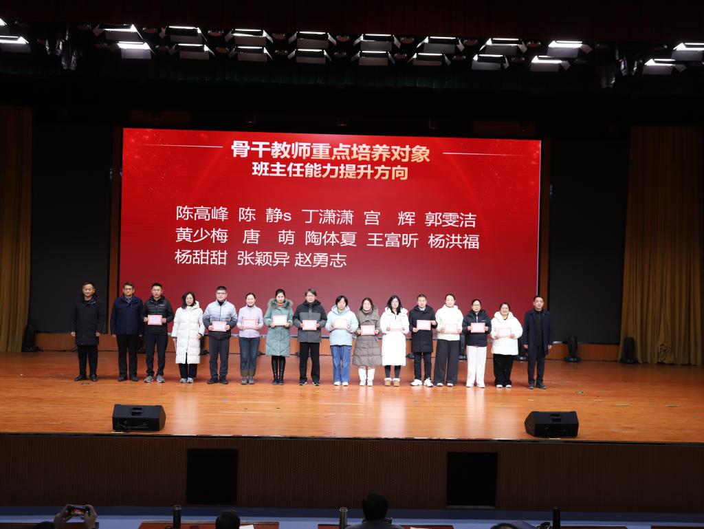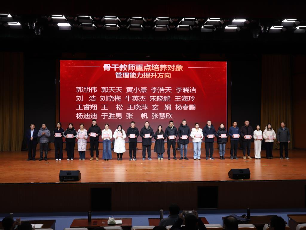第二项议程为骨干教师重点培养对象颁发证书。校党委委员、纪检书记韩克欣,校党委委员、副校长马海忠和部分中层领导分别为在管理能力提升方向、课堂教学改革创新能力提升方向、教学研究能力提升方向和班主任能力提升方向表现突出的83位老师颁发证书。