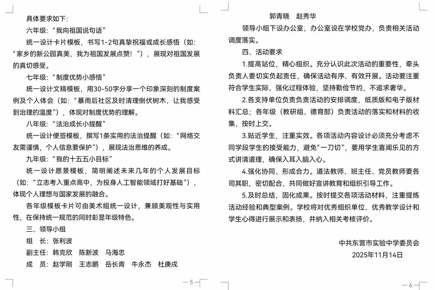 为深入贯彻落实 “用党的科学理论武装青年,用党的初心使命感召青年” 的重要要求,推动党的二十届四中全会进校园进课堂进头脑,东营市实验中学以 “深学全会精神・赋能成长之路” 为主题,精心筹划并扎实开展了全会精神多样化宣讲活动,让科学理论深植莘莘学子心田,让思想之光点亮少年青春奋进之路。