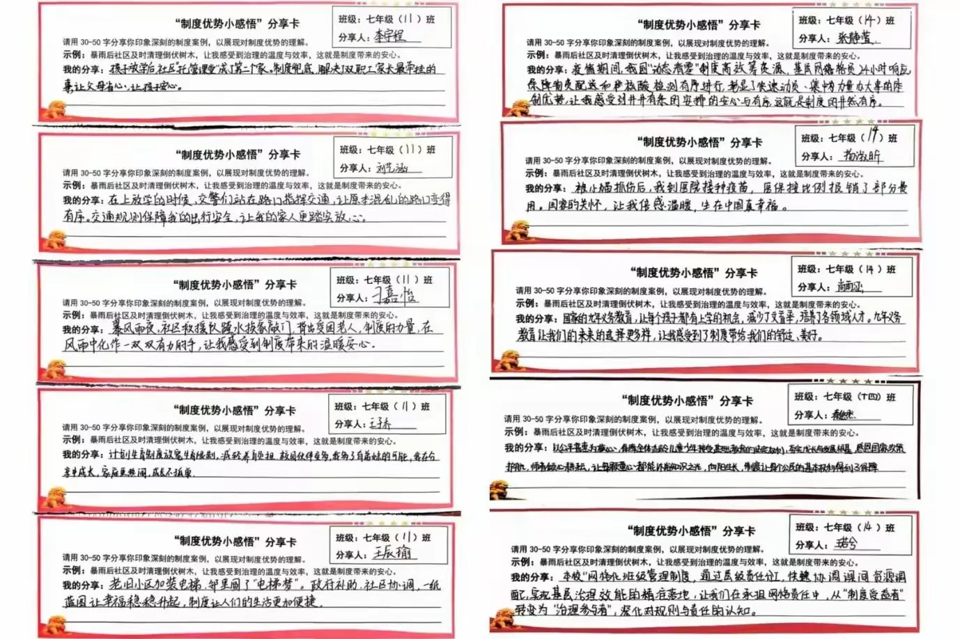 这份深刻理解化作 “制度优势小感悟” 随笔,字里行间尽显思考,篇篇恳切展现出对中国特色社会主义制度优势的深刻理解。同学们以少年视角观察社会,以理性思维分析现象,在文字中探寻真理、坚定信念,不仅深化了对国家发展的认知,更增强了民族自豪感与制度认同感,彰显了新时代青少年的理论自觉与政治担当。
