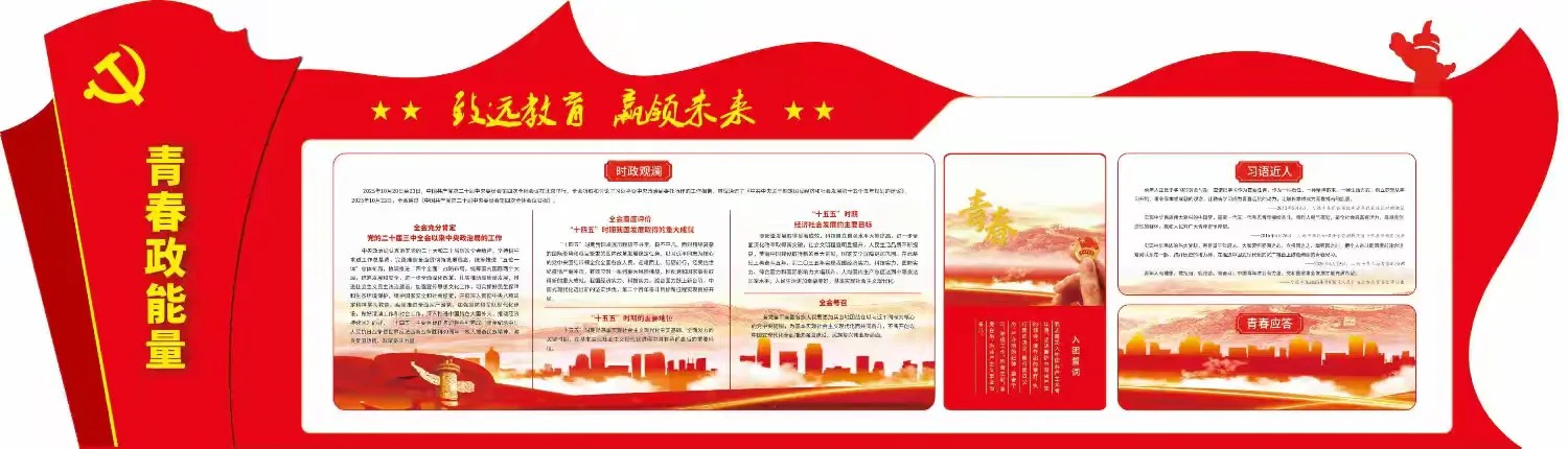 我校精心打造以“青春政能量 ”为主题的党建宣传专栏,作为筑牢青年思想根基、传递时政精神的重要抓手。专栏生动解读二十届四中全会核心内容,展示习近平总书记对青年的殷切寄语,并融入学生在科技创新、志愿服务、乡村振兴等领域的实践案例,引导学生学思践悟,将时政精神转化为成长动力,以实际行动回应时代召唤、释放青春政能量。