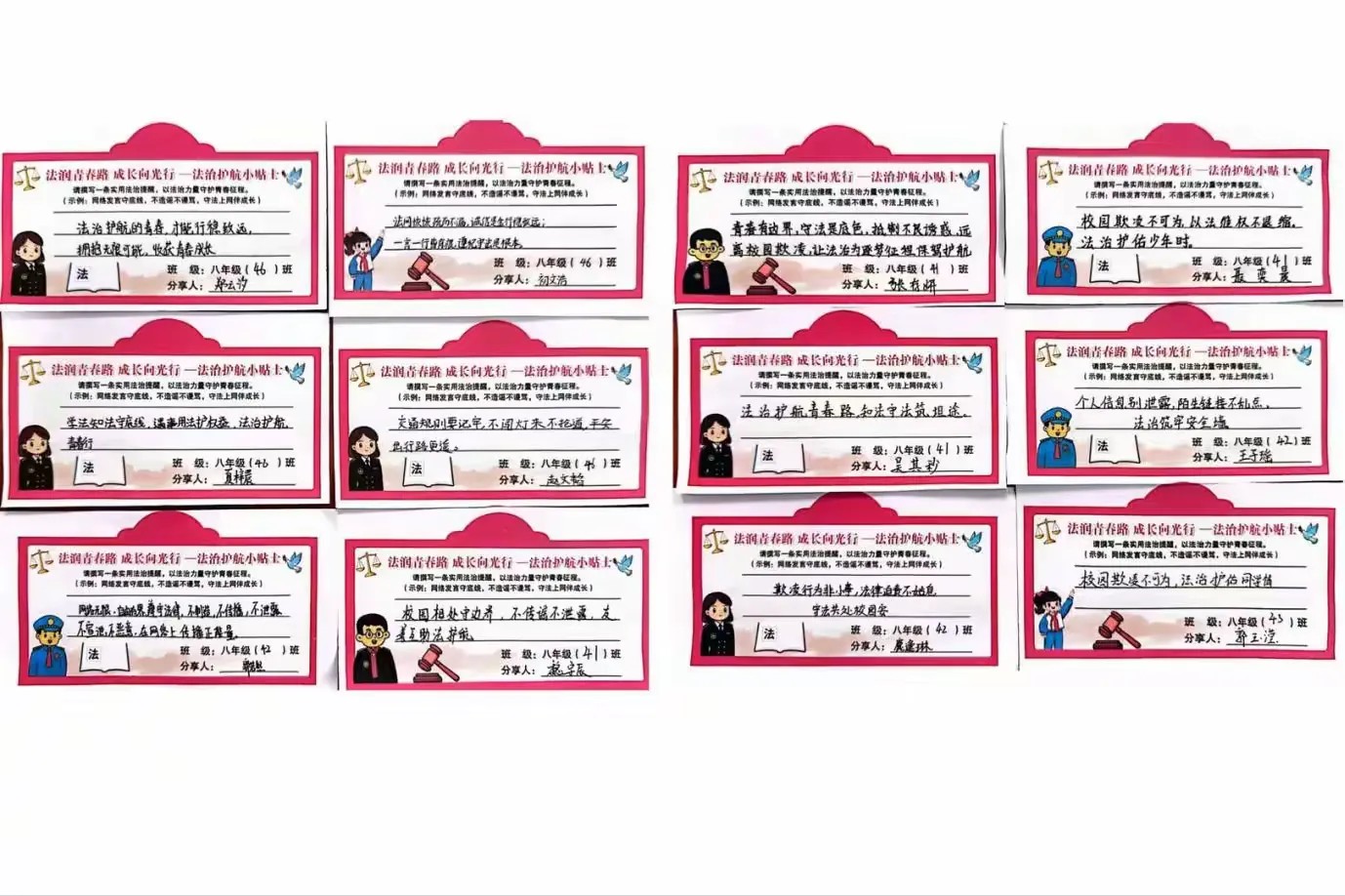 这份体会生动转化为 “法治成长小提醒” 创意便签。老师们以 “贴近生活、实用易懂” 为原则,引导同学们提炼法治感悟、分享维权技巧。“网络发言守底线,不信谣不传谣,守法上网伴成长”“校园欺凌不可为,不施暴不旁观,依法维权护尊严”“未成年人有保护,不辍学不务工,依法成长受关爱”…… 一张张设计新颖的便签言简意赅凝聚初心,条条走心孕育着青少年法治思维的萌芽与觉醒,既落地了法治教育成果,也为健康成长筑牢了法治屏障。