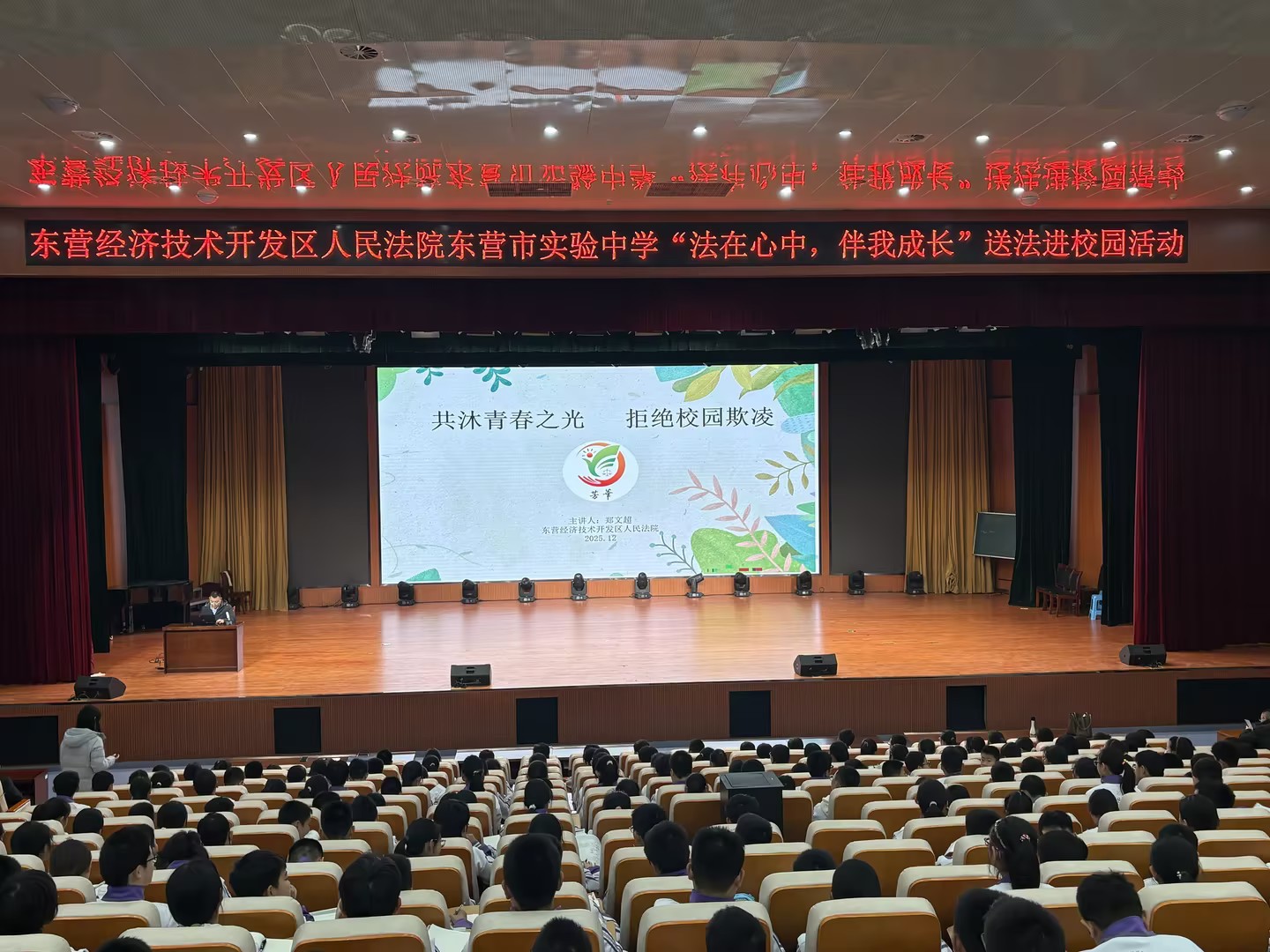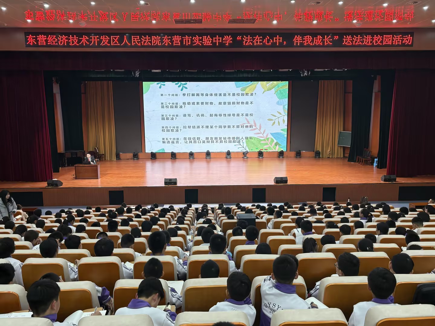 12月18日下午,由东营市实验中学与东营经济技术开发区人民法院联合举办的以“法在心中,伴我成长”为主题的送法进校园活动。活动由校安保处主任胡尊祥主持。开发区法院郑文超法官受邀为我校师生带来一堂生动深刻的法治报告。