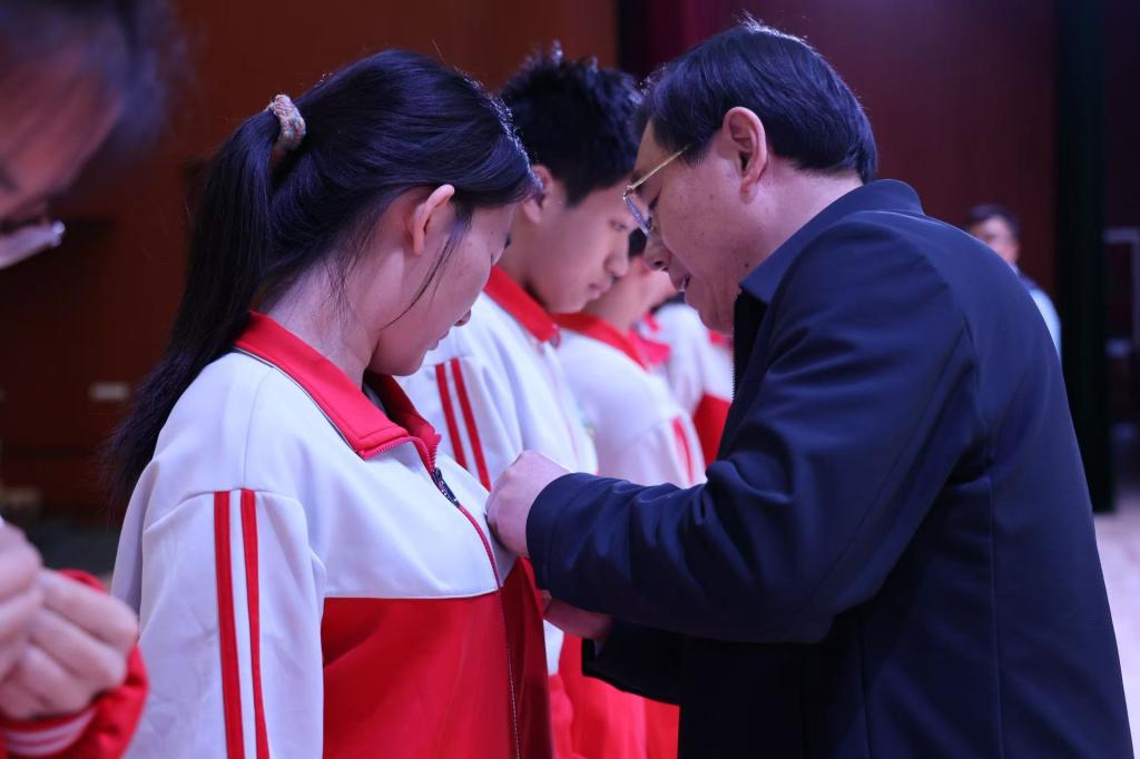 仪式在庄严的国歌声中拉开帷幕。学校办公室副主任、团委副书记曹婉婉宣读了关于批准462名同学加入中国共产主义青年团的决定,现场响起热烈的掌声,向新团员表示祝贺。随后,与会领导为团员代表佩戴团徽、颁发团员证,一枚枚闪耀的团徽承载着责任与使命,一份份团员证见证着青春与信仰。
