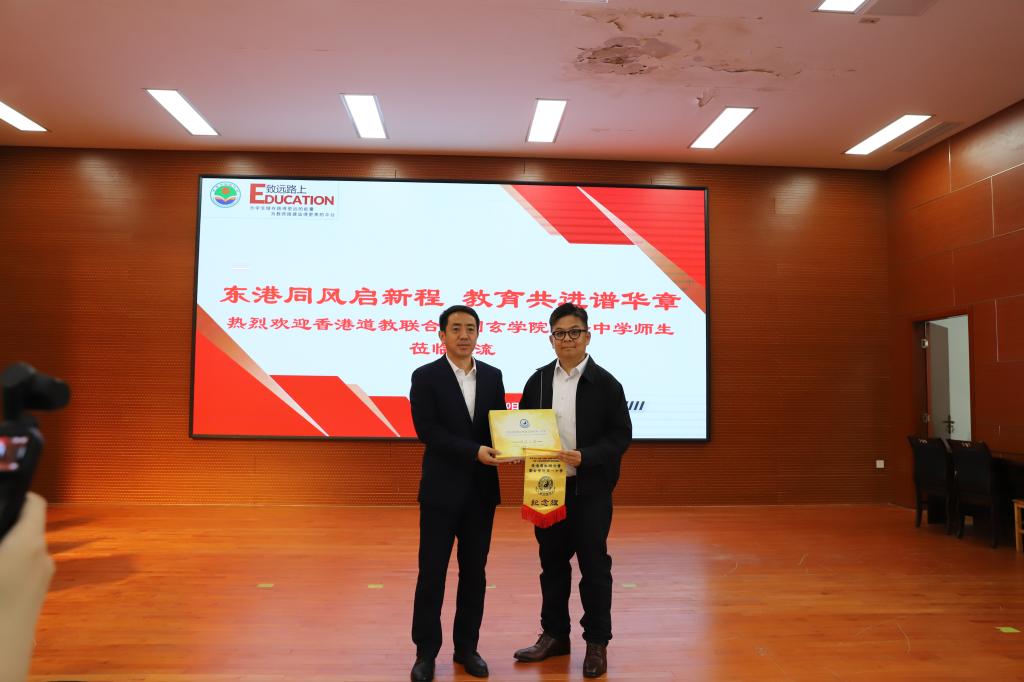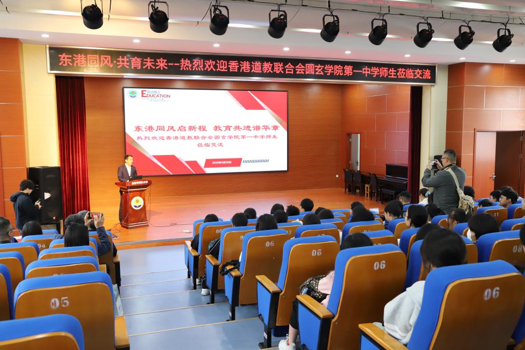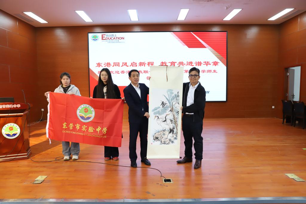 欢迎仪式上,两校精心制作的学校宣传片相继播放,让双方师生直观领略了各自的办学理念、校园文化与育人成果。东营市实验中学校党委委员、副校长马海忠热情致辞,代表学校向交流团致以诚挚问候,并阐释了学校的育人初心与发展愿景,强调两校教育文化交流对拓宽师生视野、增进同胞情谊的重要意义,表达了深化合作共赢的美好期盼。香港道教联合会圆玄学院第一中学学务主任关力年致辞回应,点赞东营市实验中学的办学特色与育人成效,期待以此次交流为契机促进两校携手共进。随后,双方互赠特色纪念品,传递深厚情谊。