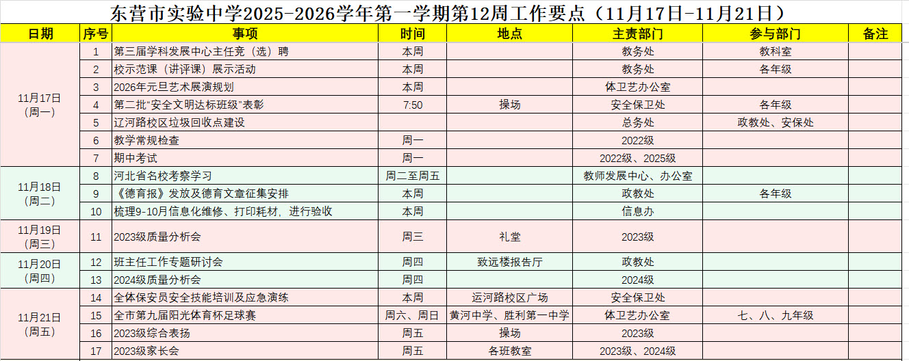 东营市实验中学2025-2026学年第一学期第12周工作要点
